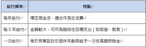 因此,在選擇保單時,應思考自己的資金使用需求,選擇對應的給付頻率。